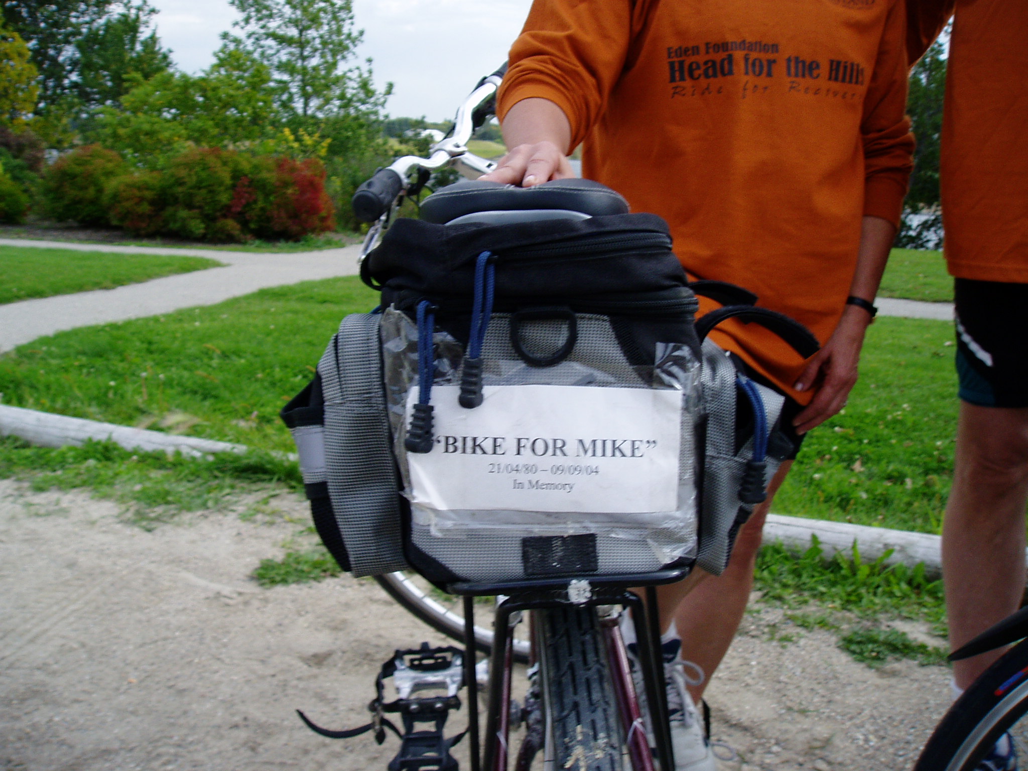 "In Memory of Michael Blair (Blopsy) Channer..." by Elisabeth Loewen Genest (aka Liesbet-Anna)  24 candles...one for each brief year of his life! 20 Sept 2004 Sharon & Gerry, you were very much in our thoughts on Saturday as we paraticipated in a "gruelling" 42 km. cyclathon along the Trans Canada Trail in southwestern Manitoba in 26'C temps. & 40-60 km. an hour winds! Mike would have loved the challenge! My (Liz) sported a "Bike for Mike" sign (see picture below)...I couldn't keep back the tears when fellow cyclists asked me about Mike. Upon our return to Winnipeg, we lit 24 candles...each representing one year of Mike's brief life!